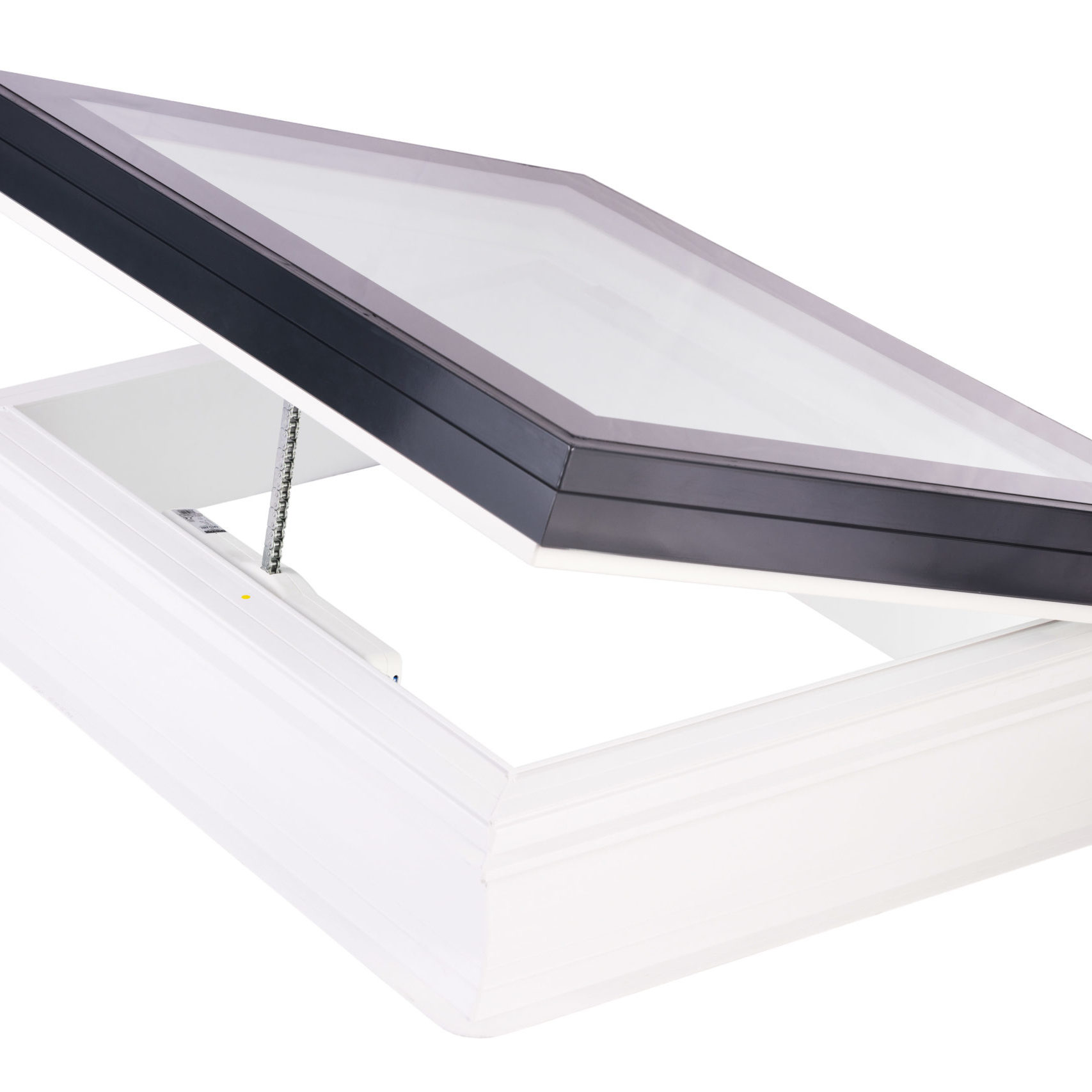| Unventilated vertical uPVC upstand fixed direct to roof, with electrically operated chain driven lifting frame and flat double glazed glass top. | DWG |